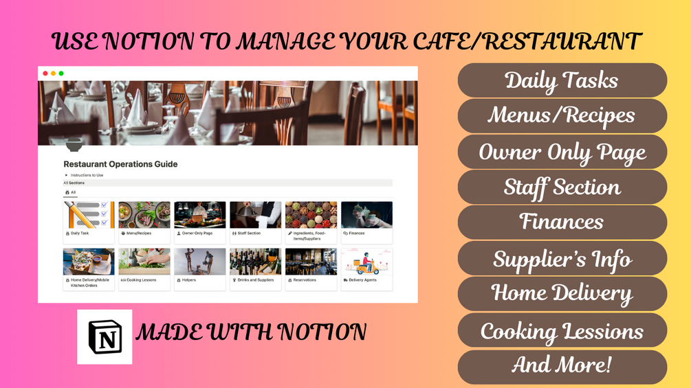 🚀 This is a comprehensive and customizable template in Notion designed specifically to transform the chaos of running a restaurant/café into a harmonious flow.